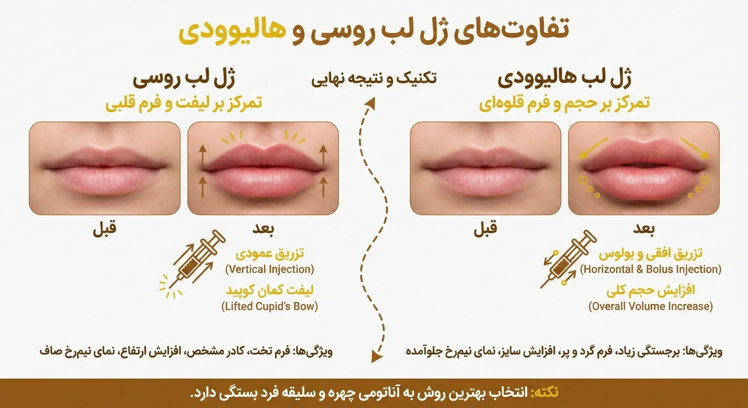 مدل لب هالیوودی تمرکز بیشتری روی فرمدهی یکنواخت، حجمسازی متعادل و ایجاد لبهای خوشفرم و برجسته دارد، در حالی که مدل لب روسی بیشتر لبها را به سمت بالا لیفت میکند و فرم قلبی ایجاد میشود. هر دو مدل محبوباند اما انتخاب بین آنها به آناتومی لب و سلیقه فرد بستگی دارد.
