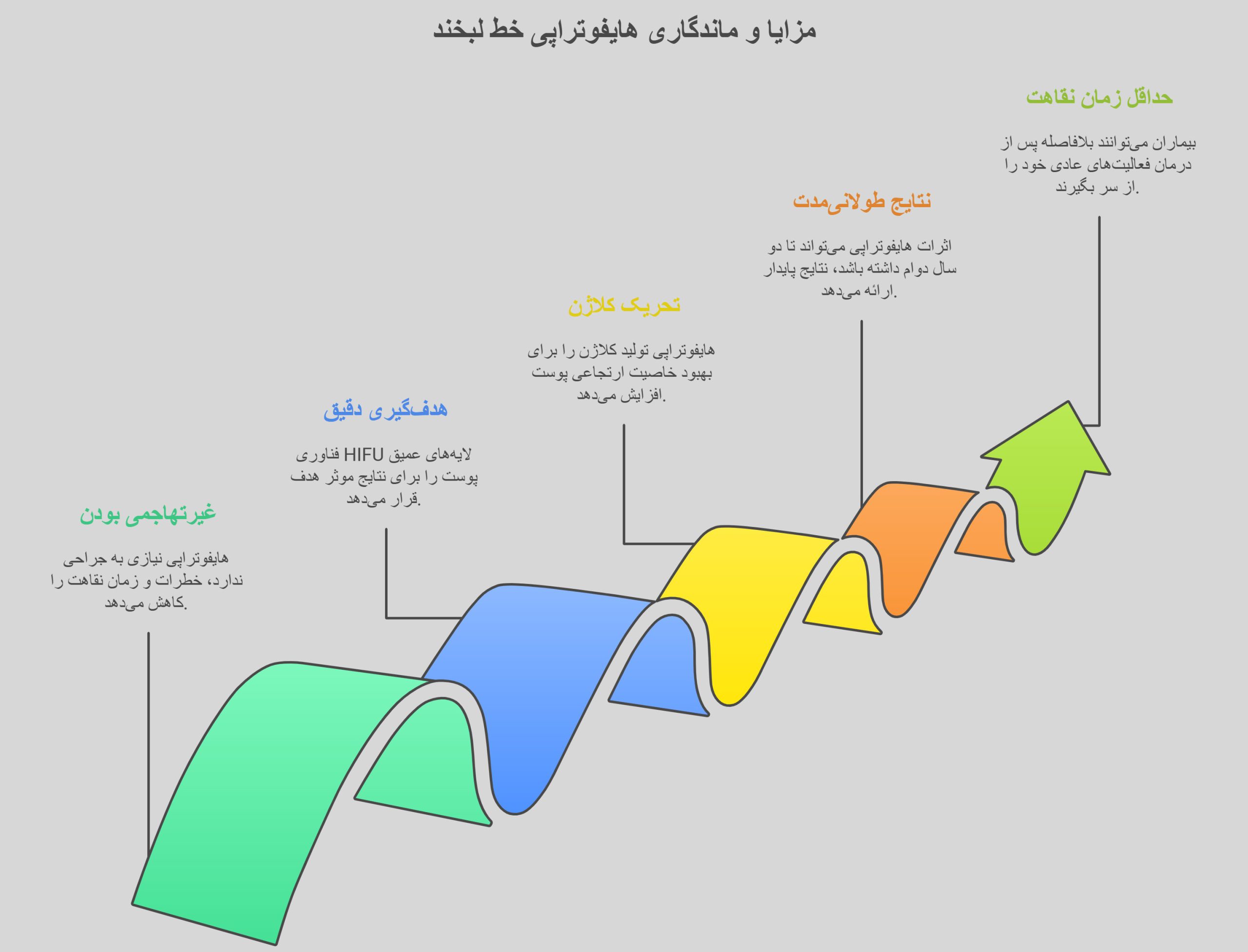 - نتایج طولانیمدت: اثرات HIFU بهمرور زمان با افزایش تولید کلاژن قابل مشاهده میشود. معمولا اثرات چند ماه پس از انجام درمان بهحداکثر رسیده و یک تا دو سال باقی میماند.