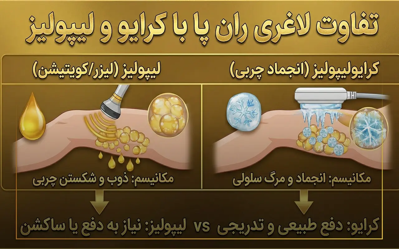 هر دو روش برای کاهش حجم موضعی، افزایش فاصله بین رانها و بهبود کانتور پا مناسباند، اما از نظر مکانیزم، تعداد جلسات، دوره نقاهت و پروفایل عوارض با هم تفاوت دارند و انتخاب نهایی بستگی به مقدار چربی، انتظارات بیمار و نظر متخصص دارد.