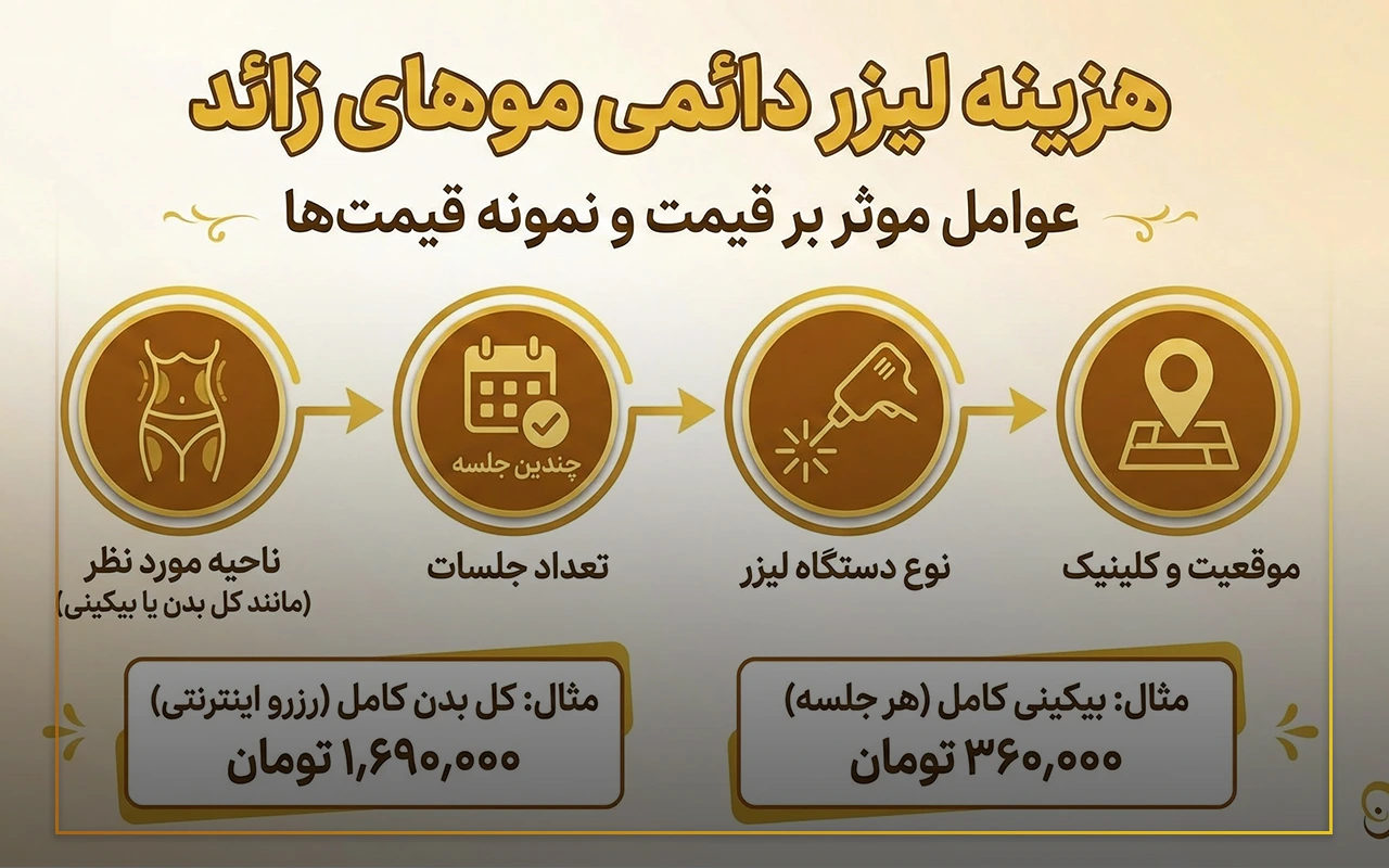 هزینه لیزر موهای زائد بهصورت دائمی به عوامل متعددی مانند ناحیه مورد نظر، تعداد جلسات، نوع دستگاه لیزر و موقعیت جغرافیایی کلینیک زیبایی بستگی دارد. به عنوان مثال، در برخی کلینیک های لیزر، هزینه لیزر کل بدن کامل (شامل کل پا، کل دست، شکم، کمر، بیکینی، زیربغل و صورت) در صورت رزرو اینترنتی ۱,۶۹۰,۰۰۰ تومان است. همچنین، در  برخی دیگر از مراکز لیزر، هزینه لیزر ناحیه بیکینی کامل برای هر جلسه ۳۶۰,۰۰۰ تومان تعیین شده است. این تفاوت‌ها نشان‌دهنده تأثیر عوامل مذکور بر قیمت نهایی هستند.