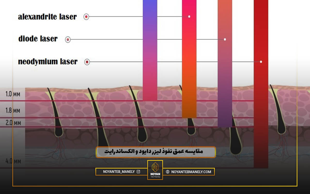 لیزر دایود با طول موج 808 نانومتر، نفوذ عمیقتری به پوست دارد و برای موهای ضخیمتر، مانند موهای بیکینی و زیر بغل، عملکرد بهتری دارد. در حالیکه لیزر الکساندرایت با طول موج 755 نانومتر، جذب بیشتری در ملانین دارد و برای پوستهای روشن و موهای نازکتر، مانند صورت و بازو، مؤثرتر است.