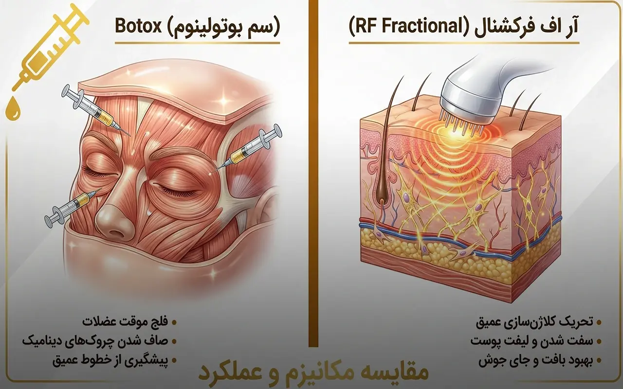 مرکز جراحی پلاستیک سیاتل (Seattle Plastic Surgery) به زبان ساده و دقیق، تفاوت در «مکانیسم عمل» و «بافت هدف» را بیان میکند.“RF microneedling treats the skin while Botox treats the muscles. … Botox injections limit the movement of strategic muscles to prevent the movements that cause wrinkles. RF microneedling helps induce collagen on the surface and in the deeper layers of the skin.”
